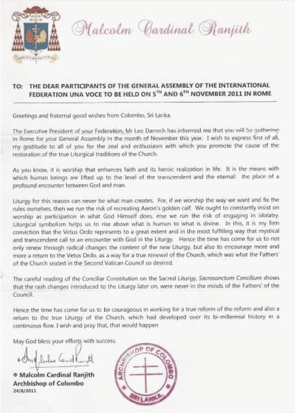 Carta del Cardenal Ranjith, arzobispo de Colombo, en Sri Lanka, dirigida a los participantes de la vigésima asamblea de la Federación Internacional Una Voce: