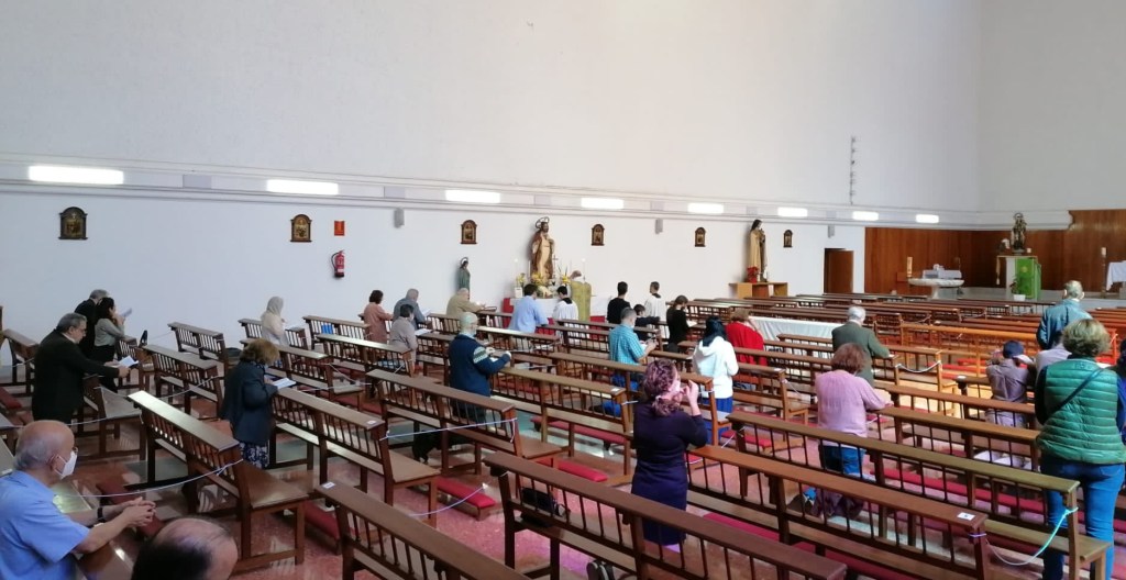 En esta entrada ofrecemos varias imágenes de la misa celebrada el pasado domingo, III después de Epifanía. Pueden observar que la celebración ya no tiene lugar en la reducida capilla del Santísimo, dado que en ella no se podía mantener la distancia de seguridad entre los fieles y, aún sin mantenerla, ya no cabíamos. Ahora, la celebración tiene lugar en el altar lateral dedicado al Sgo. Corazón, dado que las características arquitectónicas del presbiterio de esta iglesia imposibilitan celebrar «ad orientem» en el altar mayor. Es una situación anómala pero, por lo pronto, tendremos que seguir teniendo la santa misa en esas condiciones.