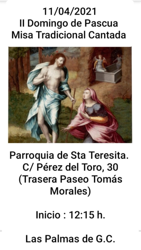 Les invitamos a participar en la celebración de la Sta. Misa Tradicional Cantada que tendrá lugar el próximo domingo, 11 de abril, II domingo de Pascua, a las 12:15h en la Parroquia de Sta. Sta. Teresita. Habitualmente nuestra celebración es Misa Tradicional Rezada, esta vez, por segunda ocasión, será Misa Tradicional Cantada, lo que supone mayor solemnidad y belleza en el culto ofrecido a Dios (canto gregoriano y polifónico, inciensación, mayor número de ministros de altar, etc). Es una buena oportunidad de acercarse a conocer la Liturgia Tradicional, hoy denominada Forma Extraordinaria del Rito Romano.