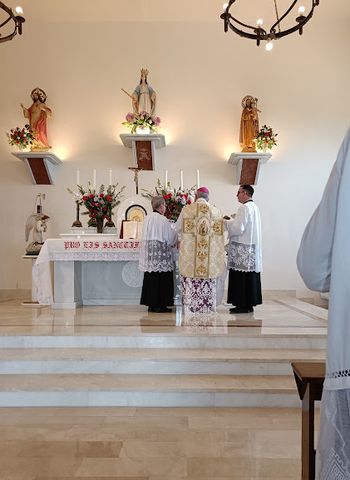 Una vez bendecido el nuevo templo, entraron los fieles en él para asistir a la primera Misa que se oficiaba en el mismo. La Santa Misa prelaticia fue celebrada por el mismo Sr. Obispo, al que asistieron el P. José Calvín, de la Fraternidad de San Pedro, y D. Gabriel Manzanares, capellán del mismo monasterio. Asistieron al acto varios sacerdotes y un numeroso grupo de fieles que llenaba la nueva iglesia, entre ellos una nutrida representación de nuestra asociación «Una Voce Córdoba» y varios miembros de la asociación hermana «Una Voce Sevilla». Se celebró Misa de Santa María Reina, a la que está dedicada la nueva iglesia.